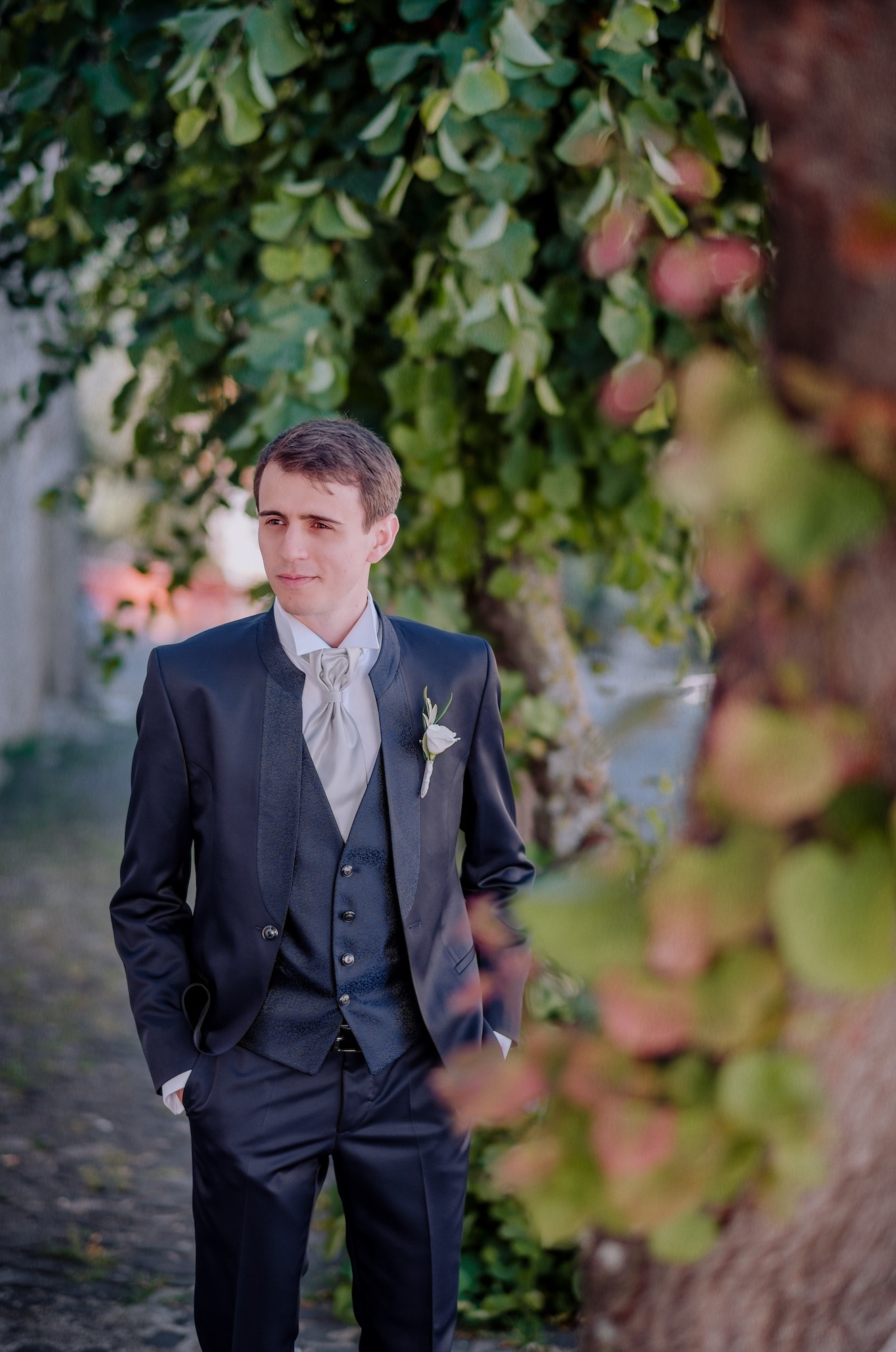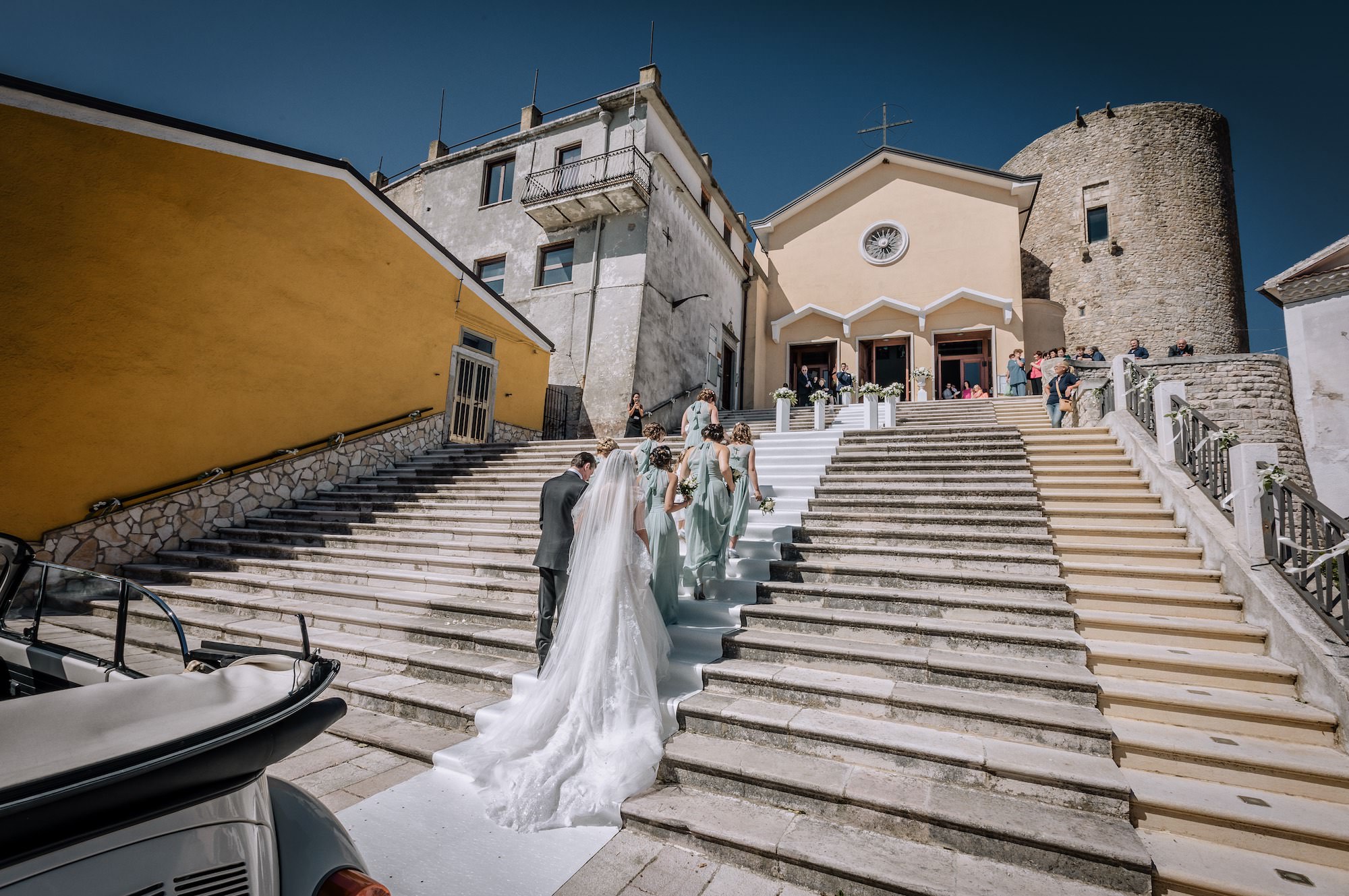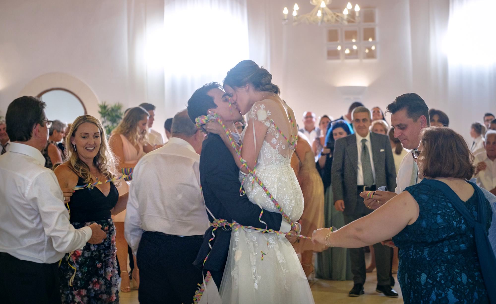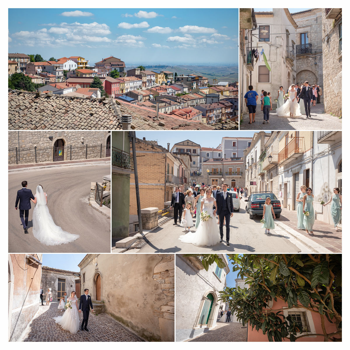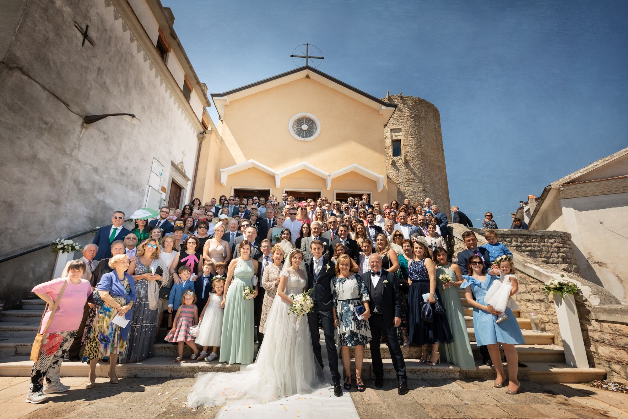 Attorno agli sposi a fare da corona con il loro affetto tanti ospiti sia italiani che venuti dall’Inghilterra, con le splendide signore ed i loro deliziosi cappelli. Unica poi l’atmosfera durante il corteo a piedi lungo le stradine, con il profumo di pomodoro e basilico che, approssimandosi oramai l’ora di pranzo, avvolgeva i vicoli del paese.