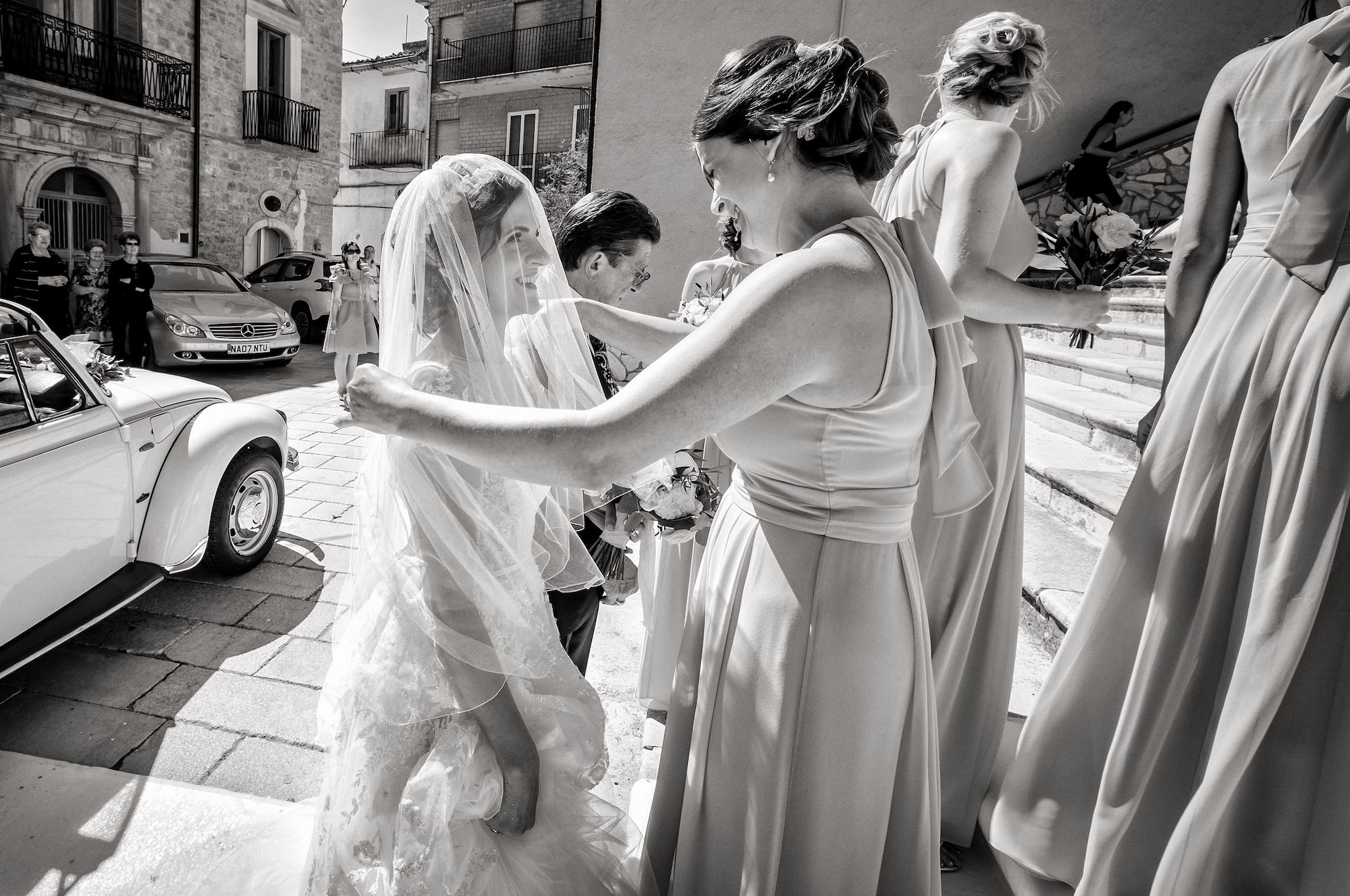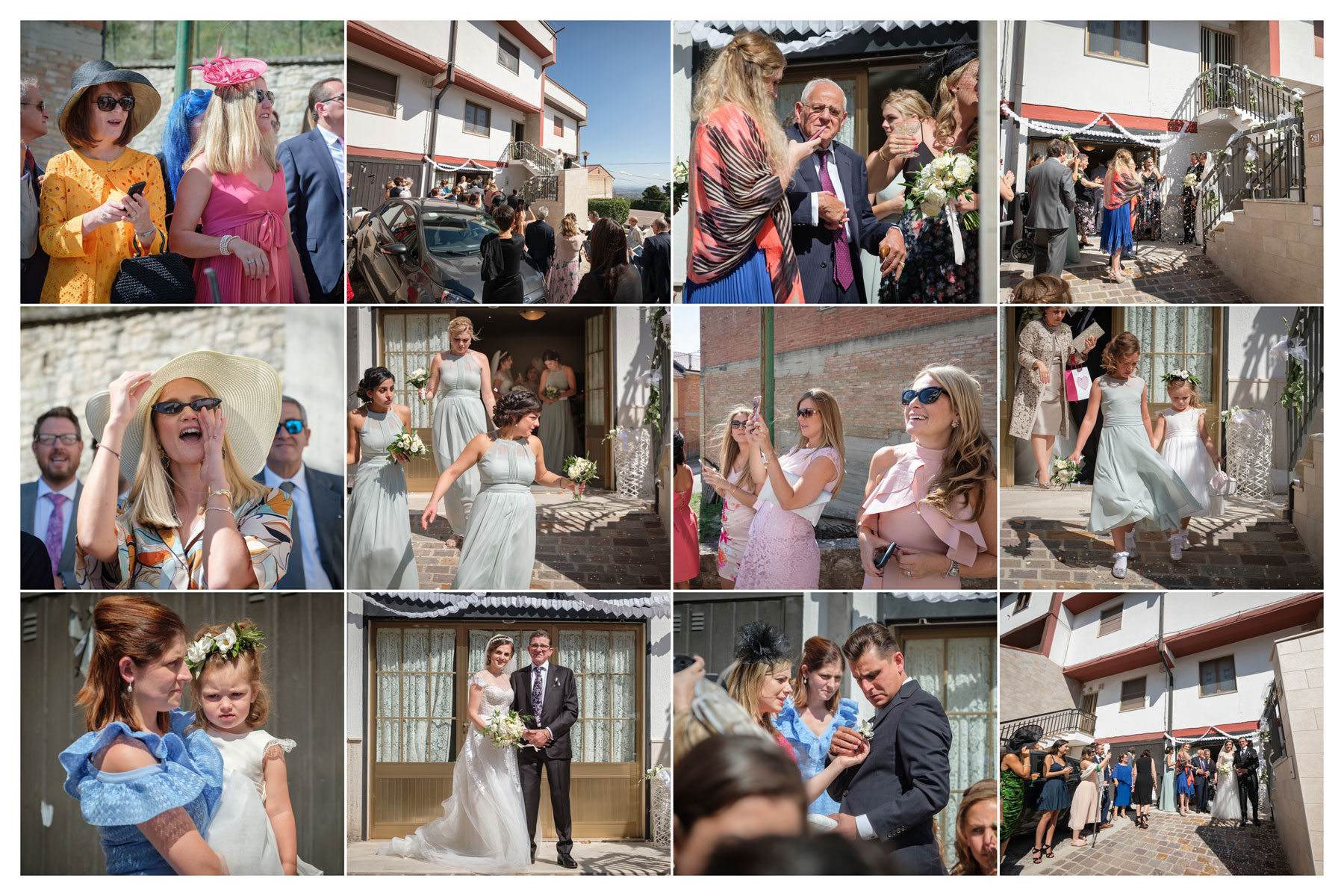 E le persone affacciate alle porte ed alle finestre a fare gli auguri agli sposini e i loro familiari in corteo.