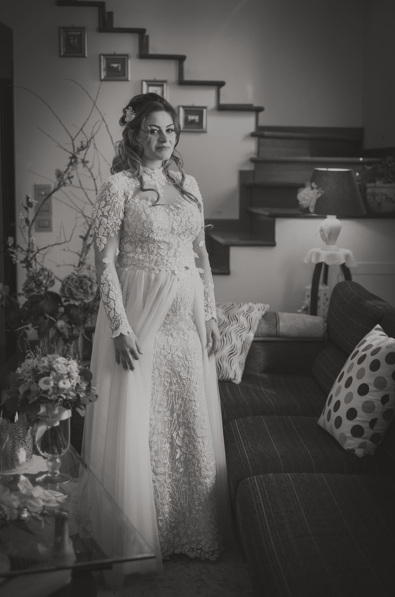 Un meteo davvero folle visto che poco meno di un’ora dopo un tenue raggio di sole passando attraverso le finestra illuminava le scarpe gioiello della sposa. Che bella Mariaelisa nel suo abito nuziale deliziosamente premaman. Abito progettato de lei stessa e poi sapientemente curato da Rosanna titolare del noto Atelier De Finis di Lucera.
