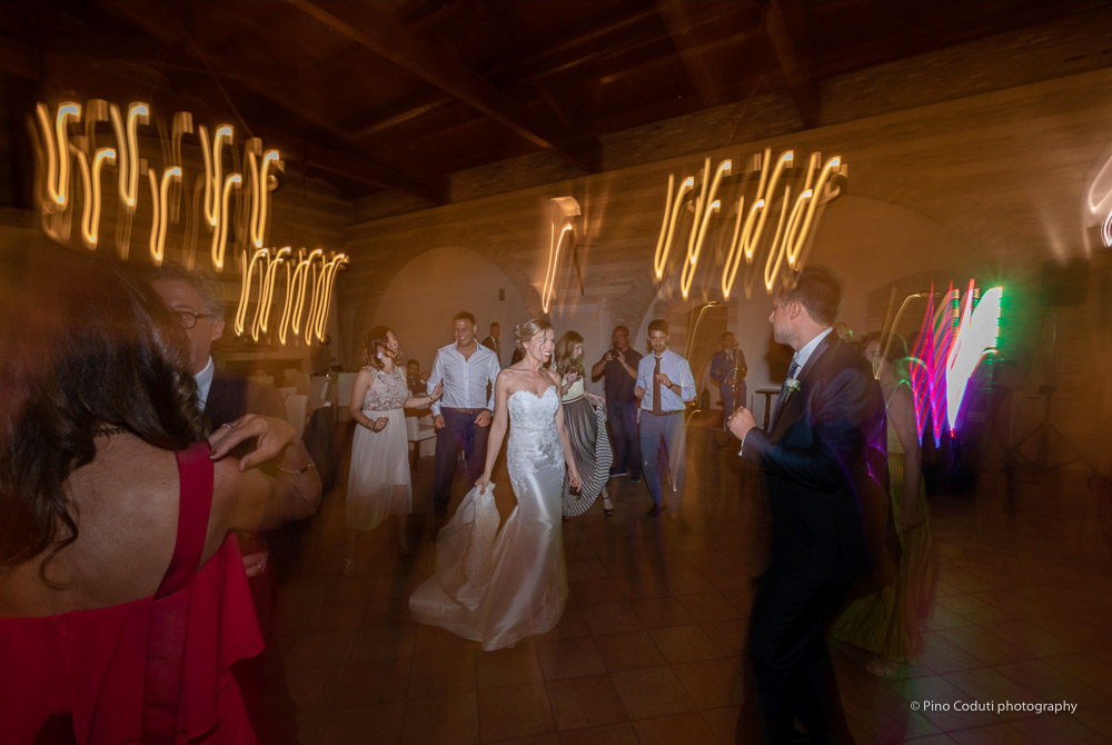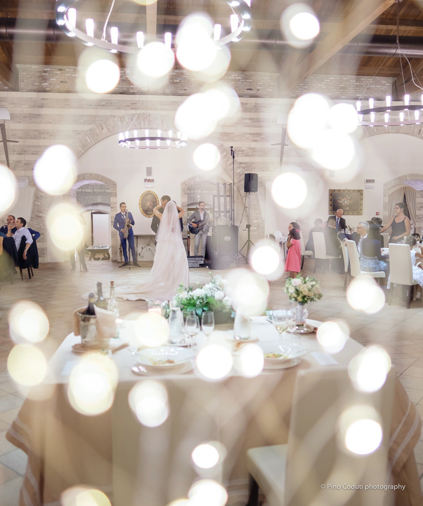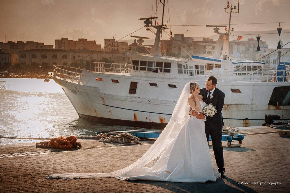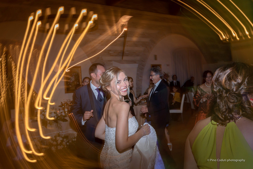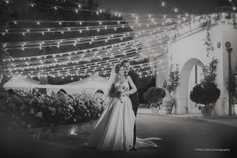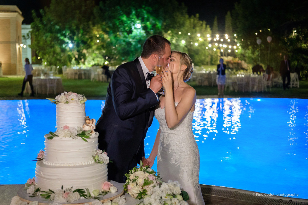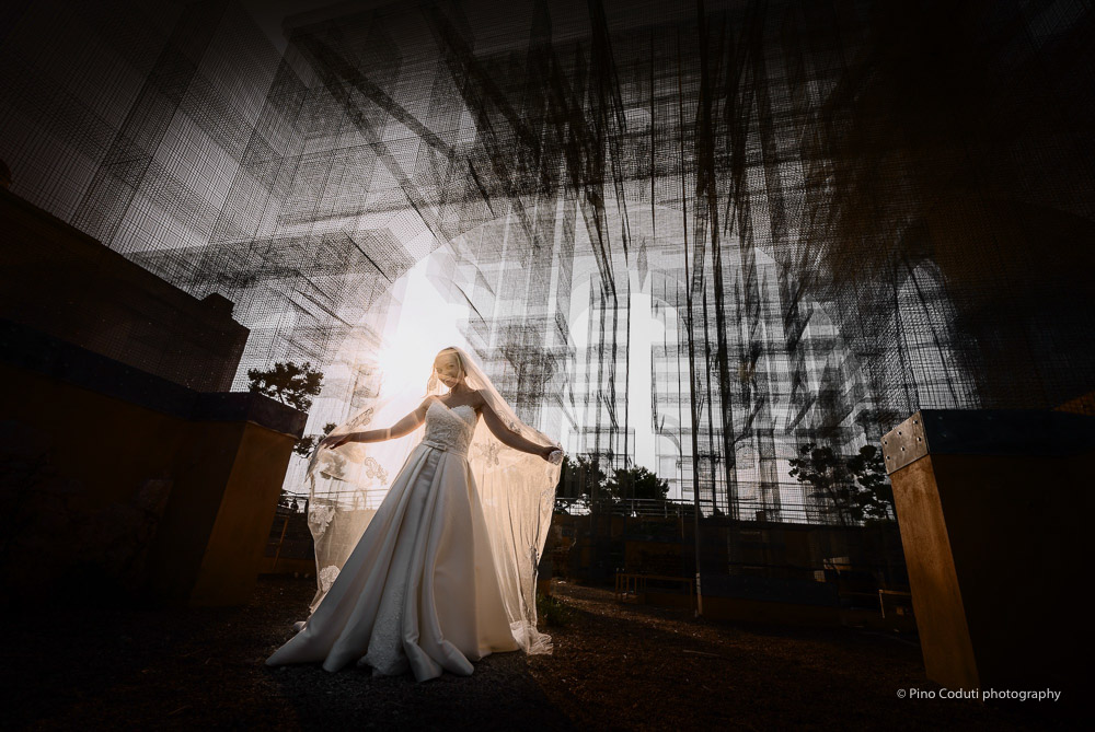 Il matrimonio si è svolto a Foggia ma per la funzione religiosa gli sposi hanno scelto uno vero e proprio scrigno di storia: la basilica di Santa Maria Maggiore di Siponto. Questa gioiello medievale è costruito sui resti di una antica chiesa romanica ma recentemente è diventata nota a livello internazionale per l’installazione monumentale dell’artista Edoardo Tresoldi. Egli infatti ha ricostruito l’antica struttura utilizzando 4.500 metri di rete elettrosaldata. La basilica di rete metallica è alta 14 metri, pesa circa sette tonnellate e le sue “trasparenze” la rendono davvero suggestiva, soprattutto di sera quando viene illuminata ad hoc. Dopo la coinvolgente funzione religiosa e l’accoglienza festosa all’uscita della basilica, con gli sposi ci siamo ritagliati uno spazio fotografico prima al porto di Manfredonia e poi , tornati a Foggia, presso Masseria Pietrafitta fotografando sotto la bellissima “vela” di luci che si stagliava all’imbrunire contro il blu cobalto del cielo. Splendidi i festeggiamenti allietati ed animati dalla musica del maestro Mino Porcelli e la sua band fino al culmine del taglio torta a bordo piscina.