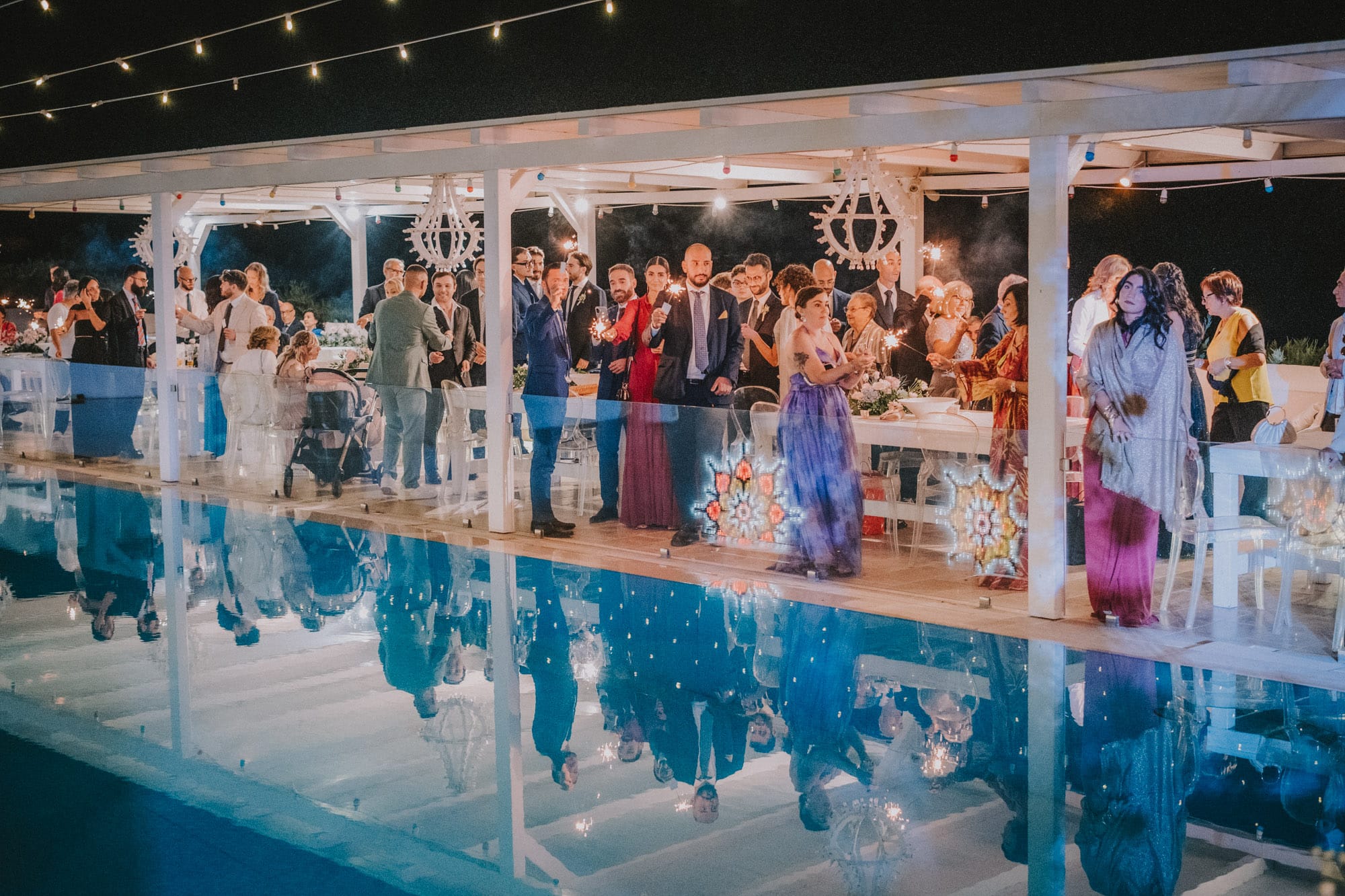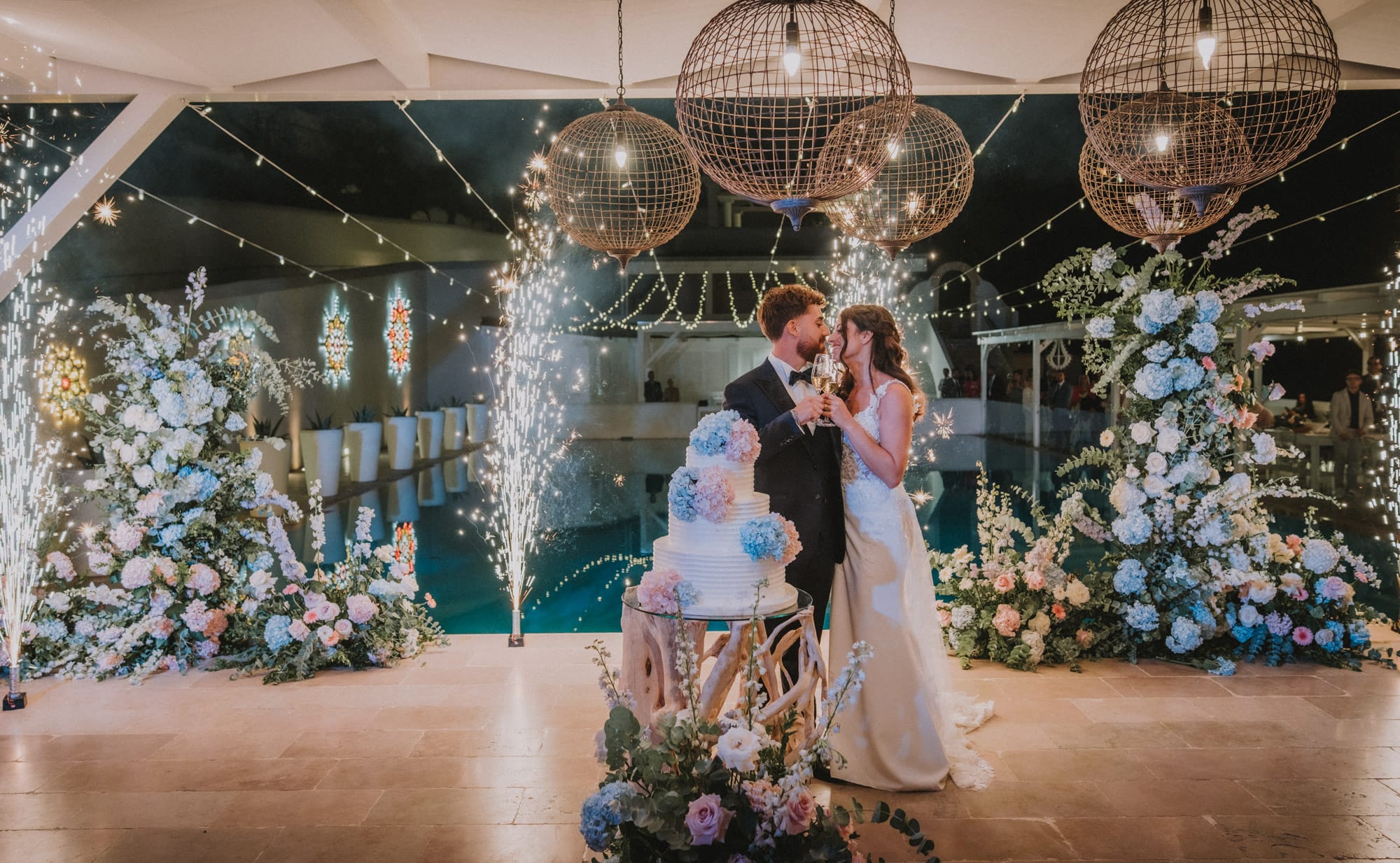 Il taglio della torta, sul bordo piscina, tra stelline luminose e scintille dorate, ha suggellato la giornata con un’atmosfera quasi cinematografica: un abbraccio, uno sguardo, un brindisi al futuro.