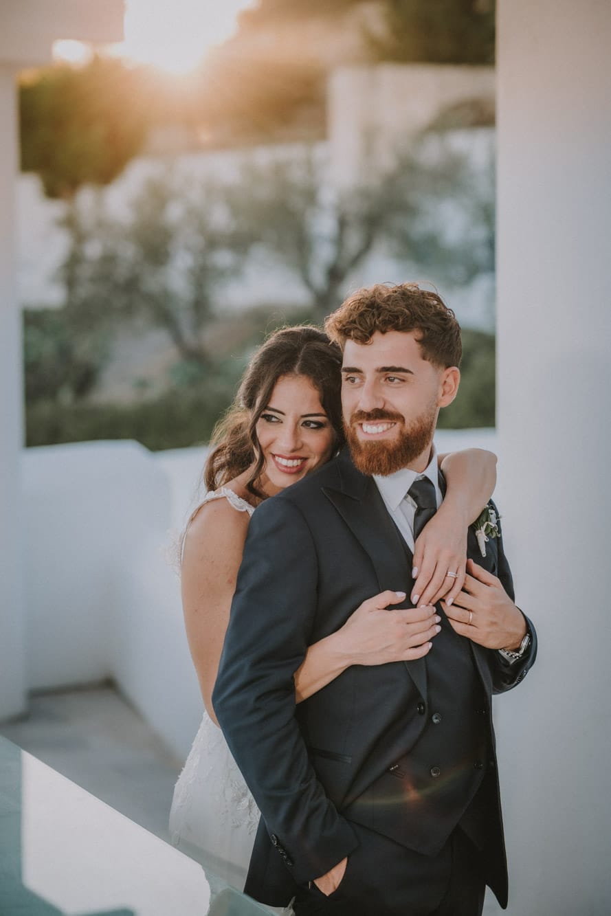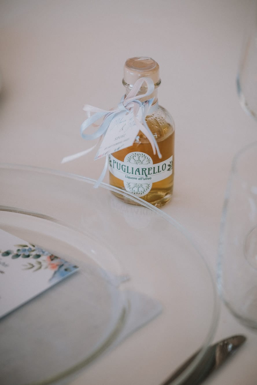Dall’uliveto di famiglia di Marco, fondato da nonno Cosimo, agli alberi secolari che circondano la Locanda del Carrubo, fino ai dettagli del ricevimento: segnaposto con liquore all’ulivo e bomboniere di olio “Meh!”, prodotto proprio dalla famiglia dello sposo.