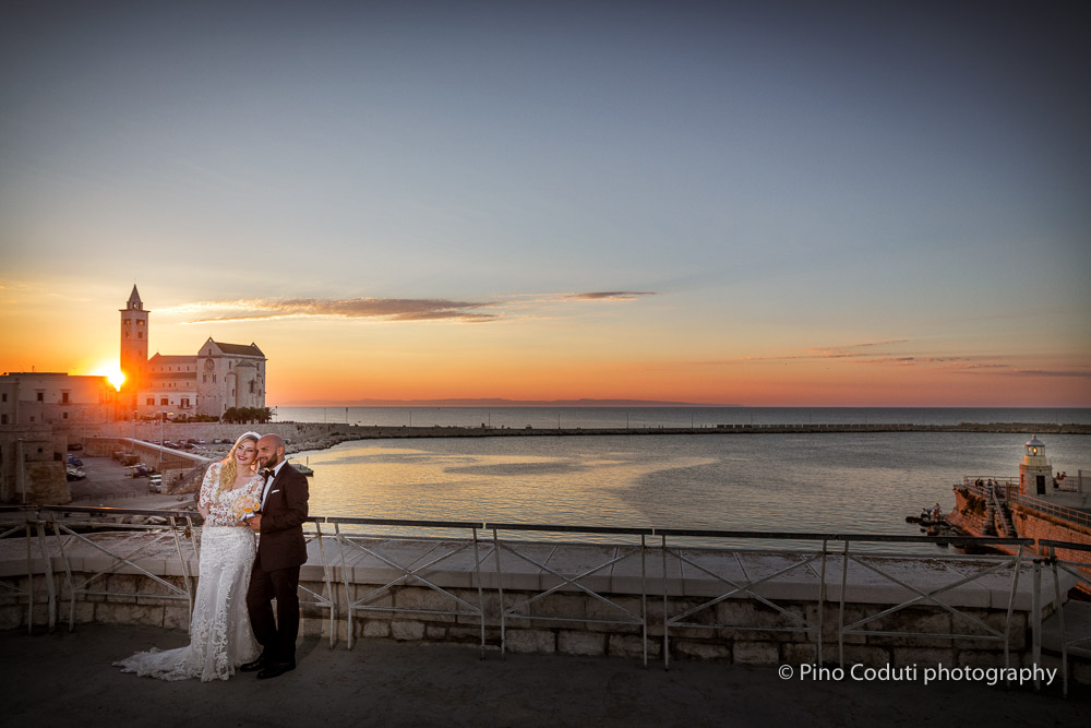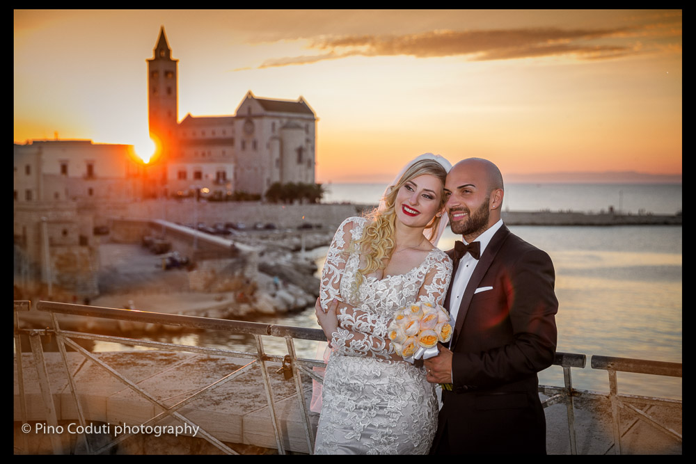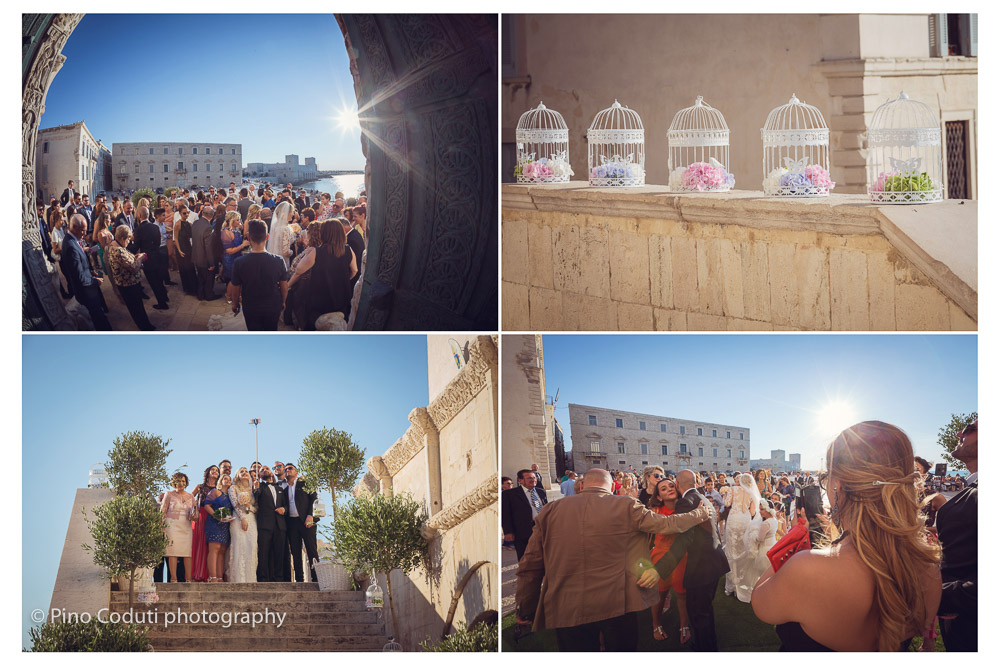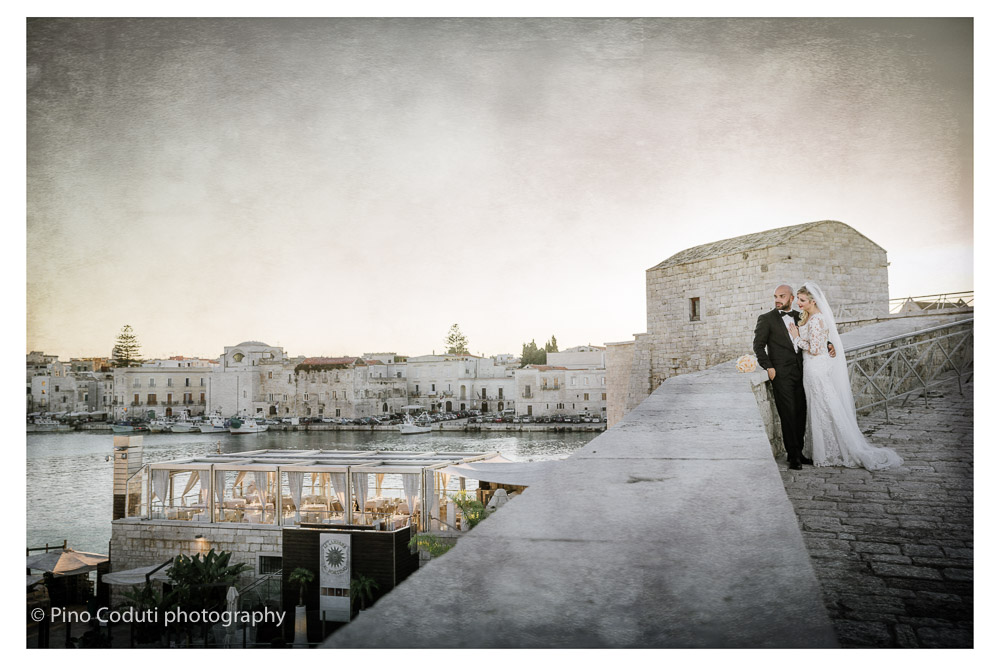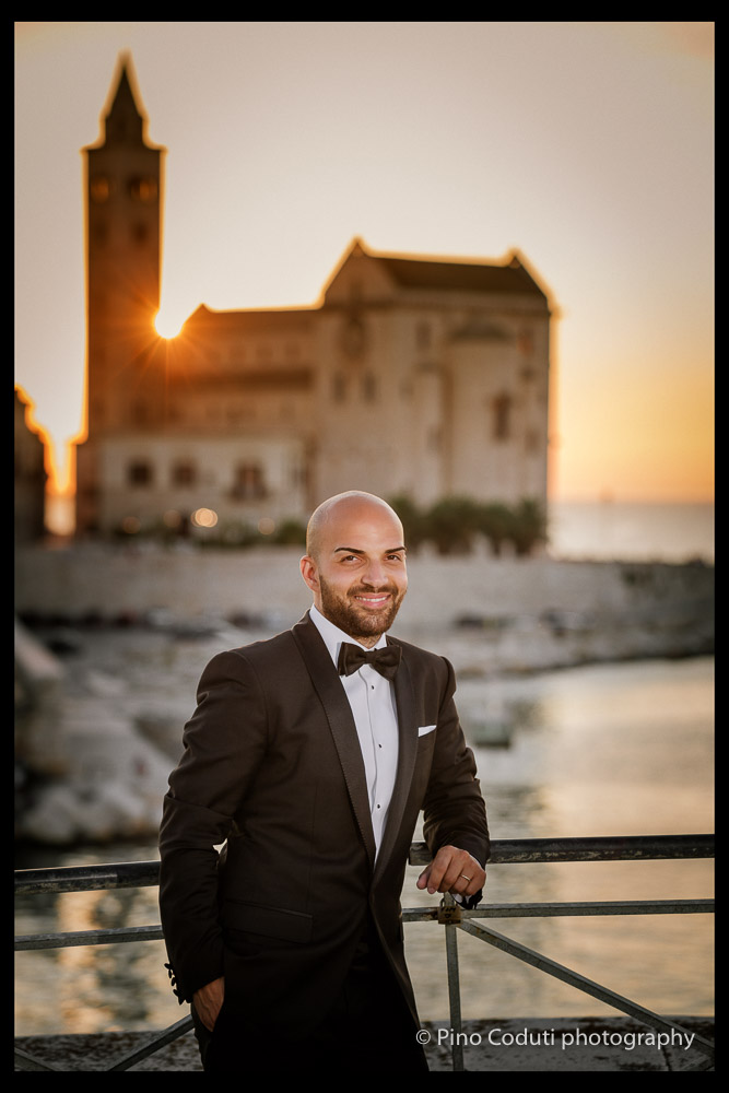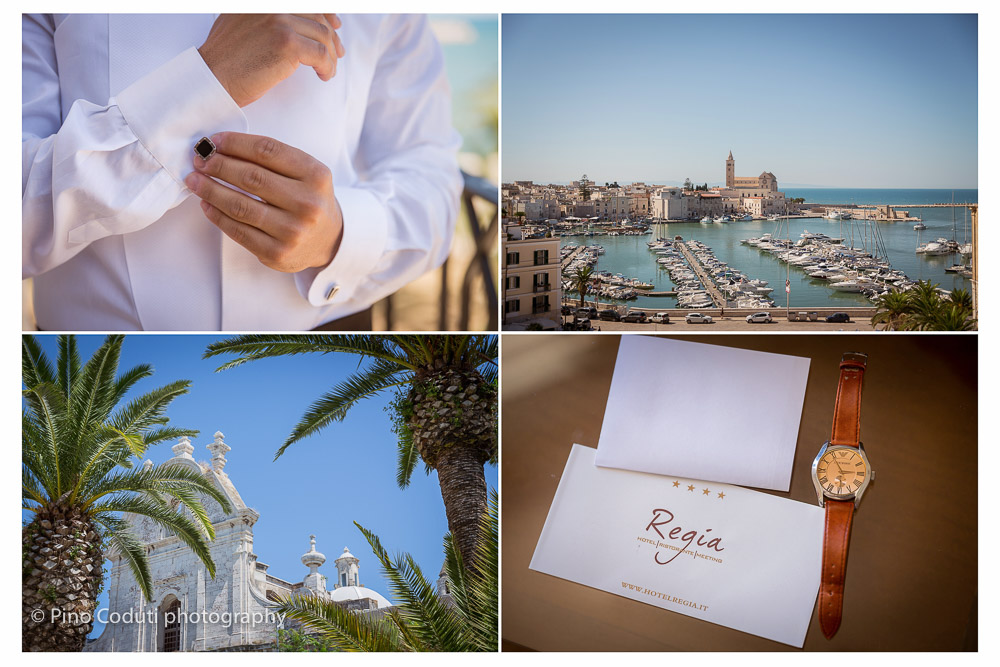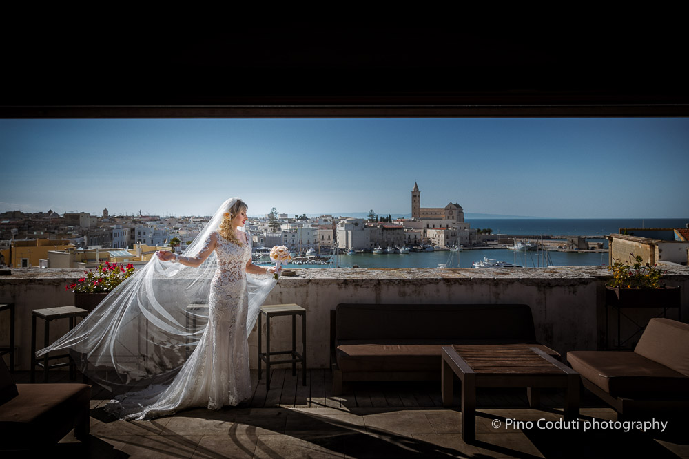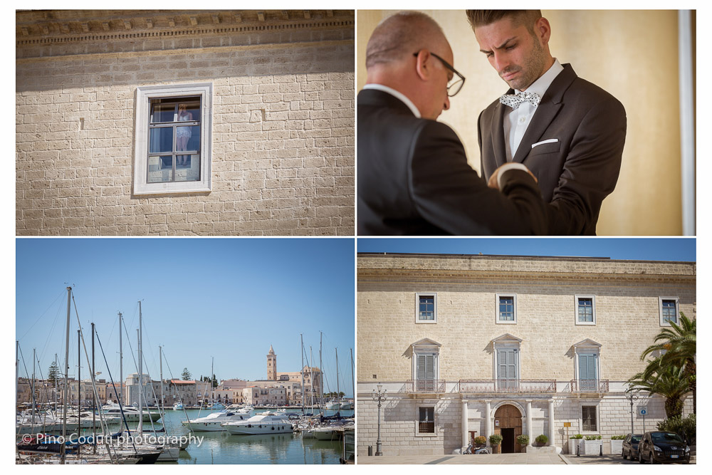 Qui lo sposo, su un balcone affacciato sul porto, terminava gli ultimi preparativi della vestizione con sullo sfondo il mare blu cobalto una veduta impagabile. A poche centinaia di metri sbirciando dietro i vetri della finestra di un altro palazzo storico stupendo il Marè Resort la sposa era assorta in un’altro panorama magnifico. Alcuni scatti agli ultimi dettagli e poi indossato l’abito siamo saliti sul terrazzo del resort da dove credo si abbia una delle viste più incredibili sulla bellissima Trani.