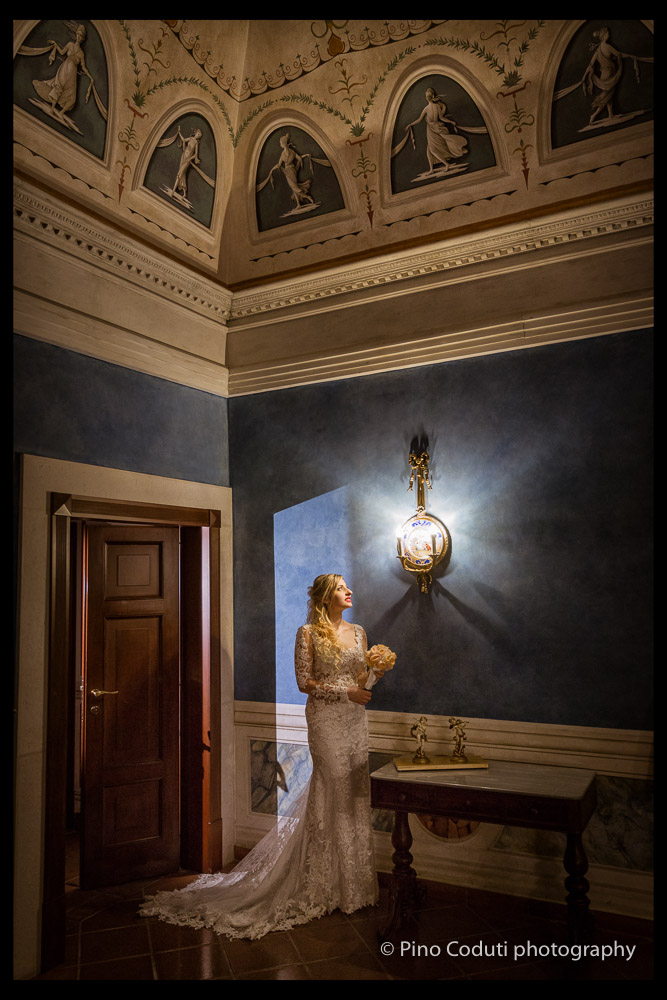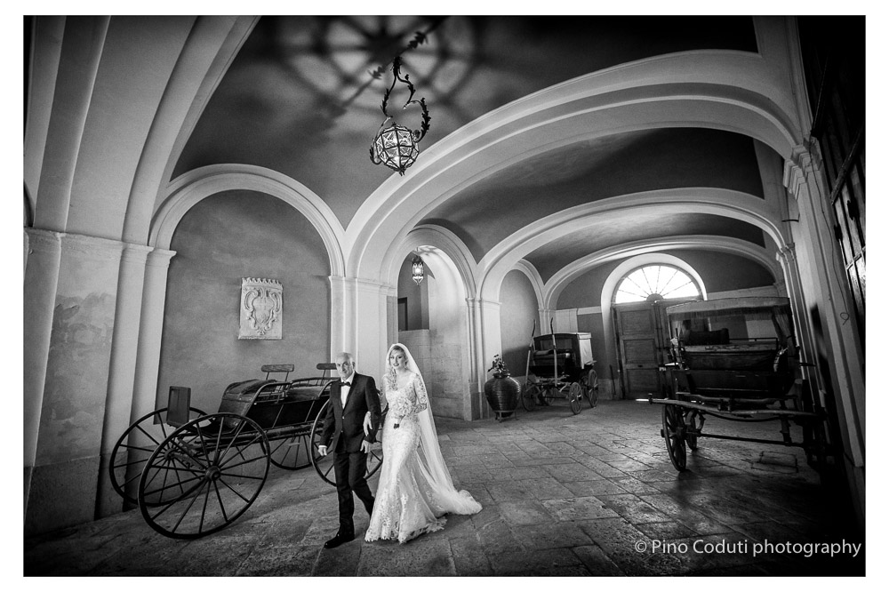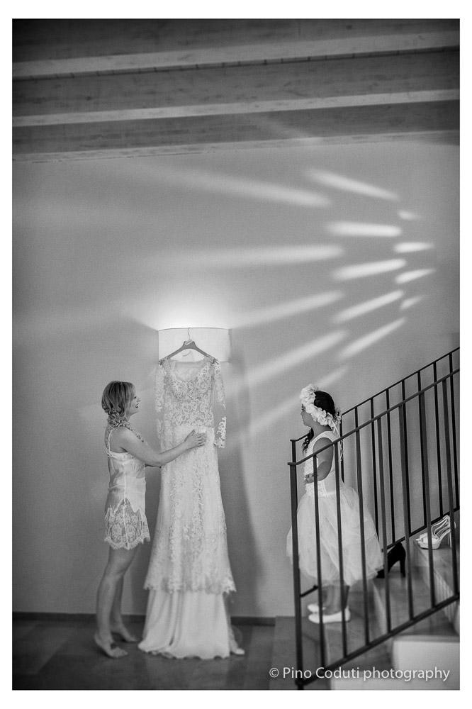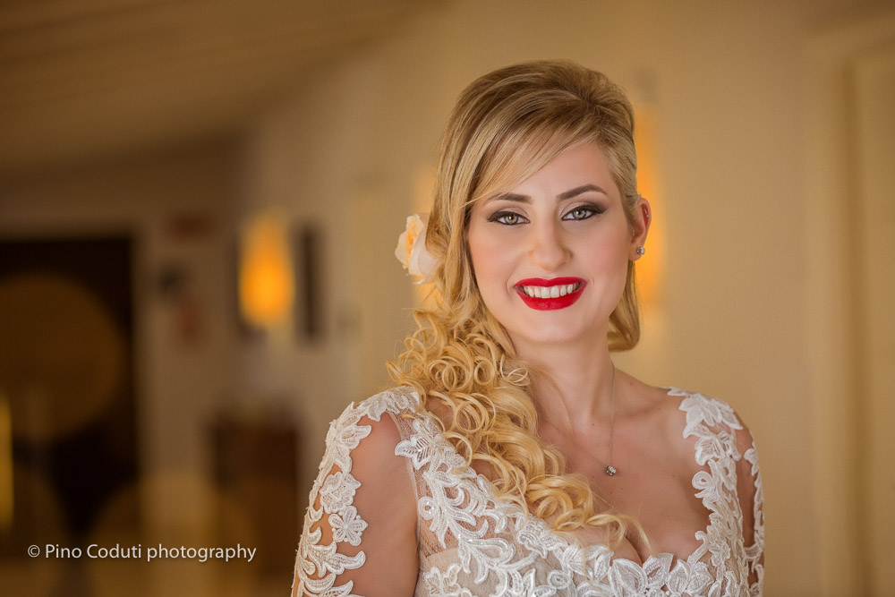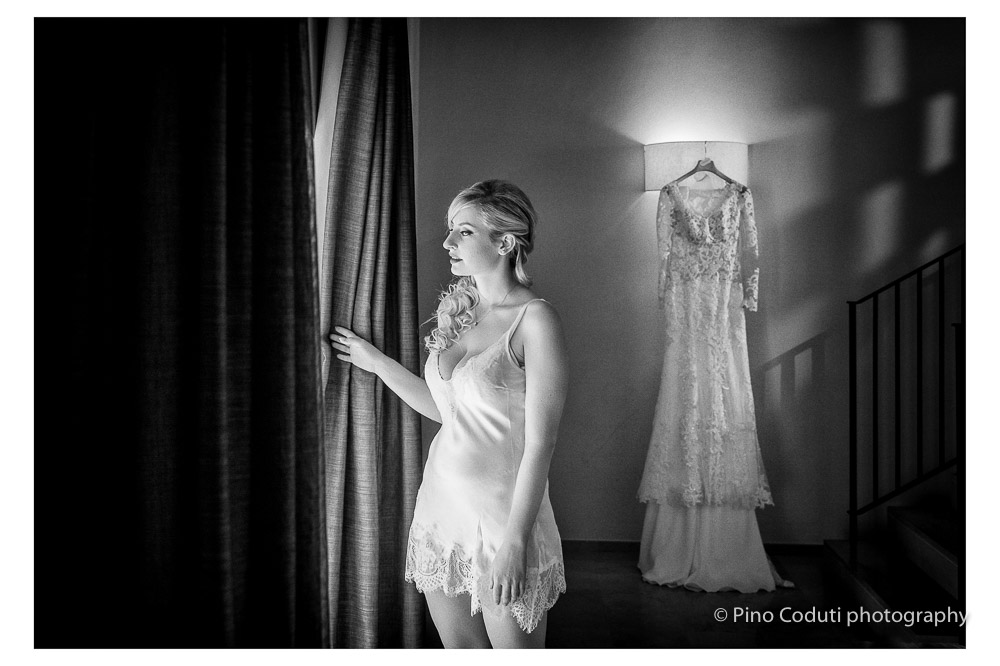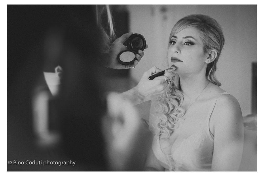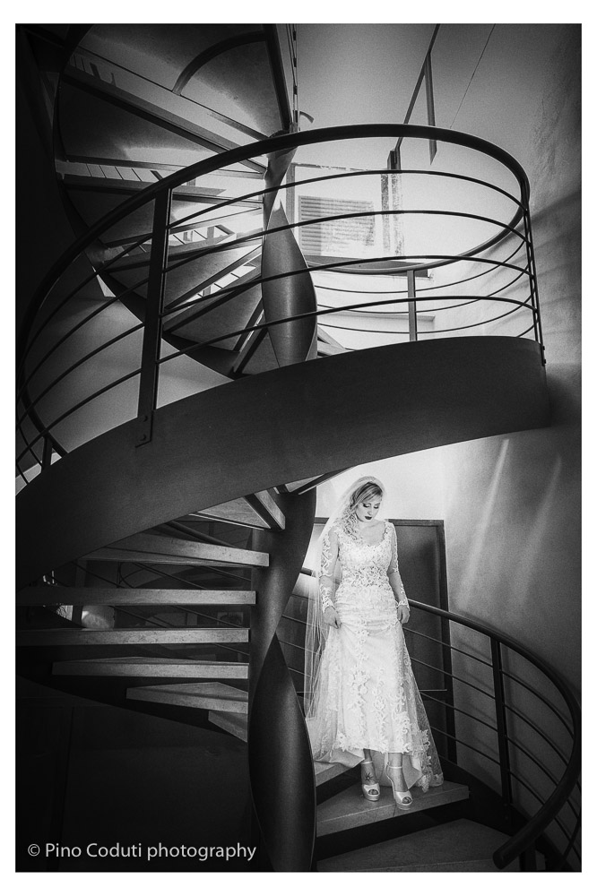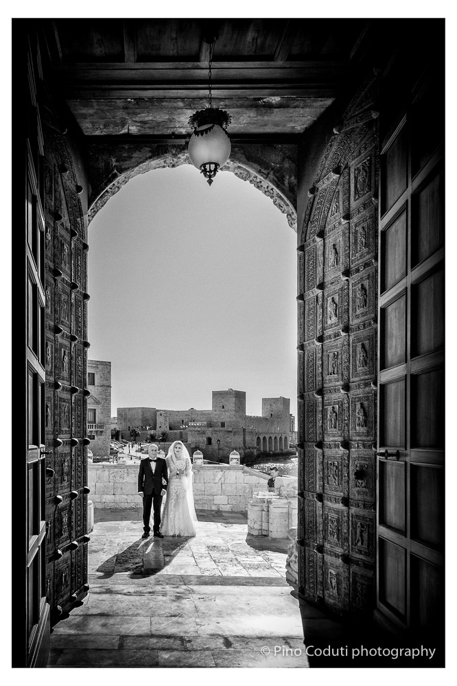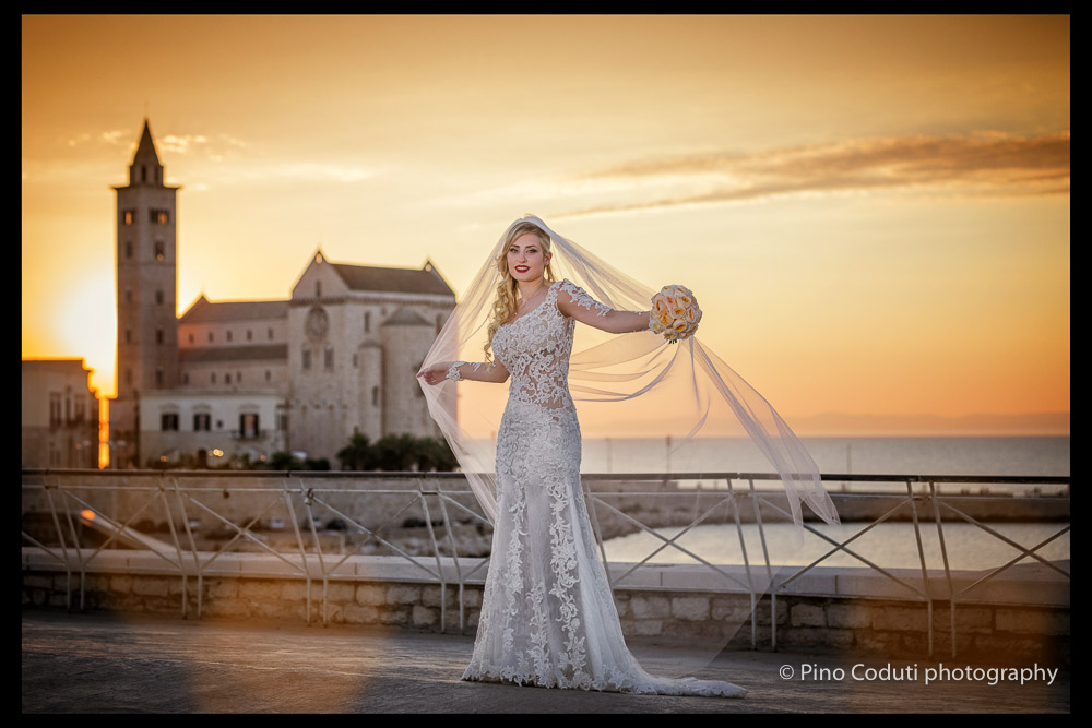 Qui lo sposo, su un balcone affacciato sul porto, terminava gli ultimi preparativi della vestizione con sullo sfondo il mare blu cobalto una veduta impagabile. A poche centinaia di metri sbirciando dietro i vetri della finestra di un altro palazzo storico stupendo il Marè Resort la sposa era assorta in un’altro panorama magnifico. Alcuni scatti agli ultimi dettagli e poi indossato l’abito siamo saliti sul terrazzo del resort da dove credo si abbia una delle viste più incredibili sulla bellissima Trani.