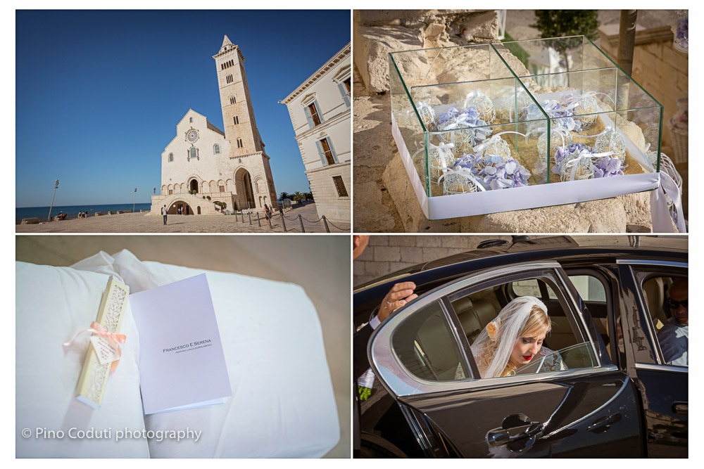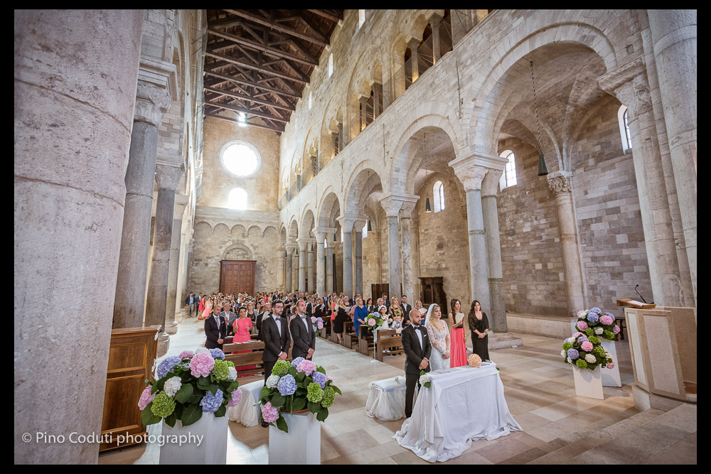 Dopo un brevissimo tragitto in auto, accompagnata dal suo papà, Serena è andata finalmente incontro al suo Francesco, attraversando con particolare emozione la navata centrale della Cattedrale di Trani “illuminata” dai delicati colori degli splendidi addobbi floreali e dalle sonorità di organo e coro.