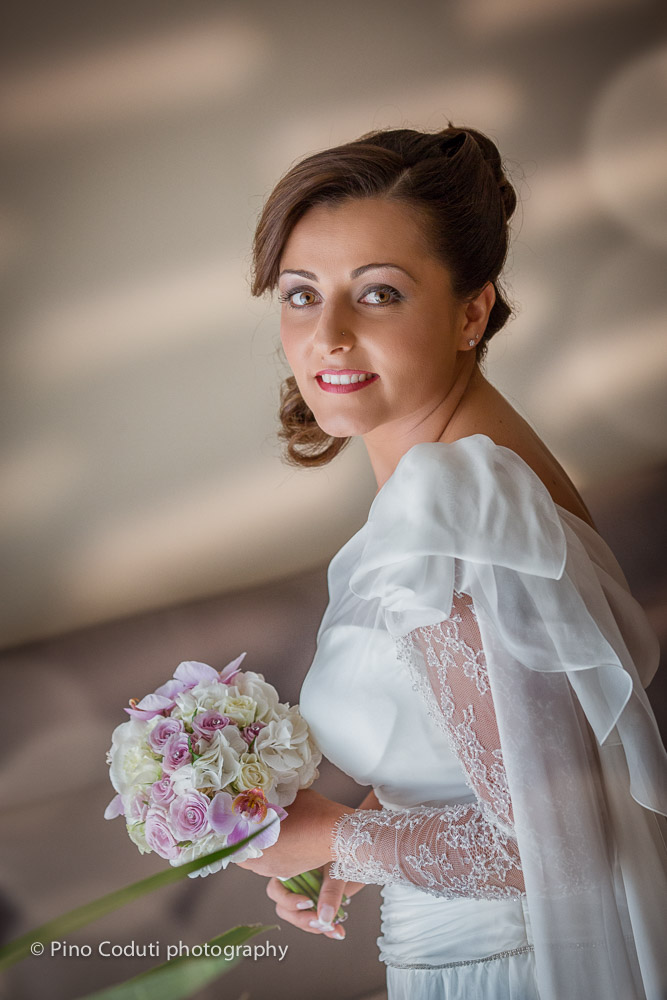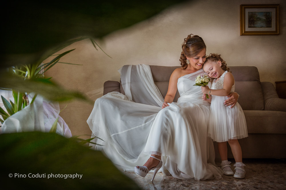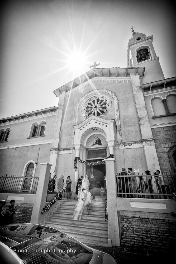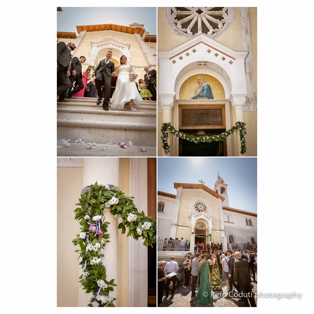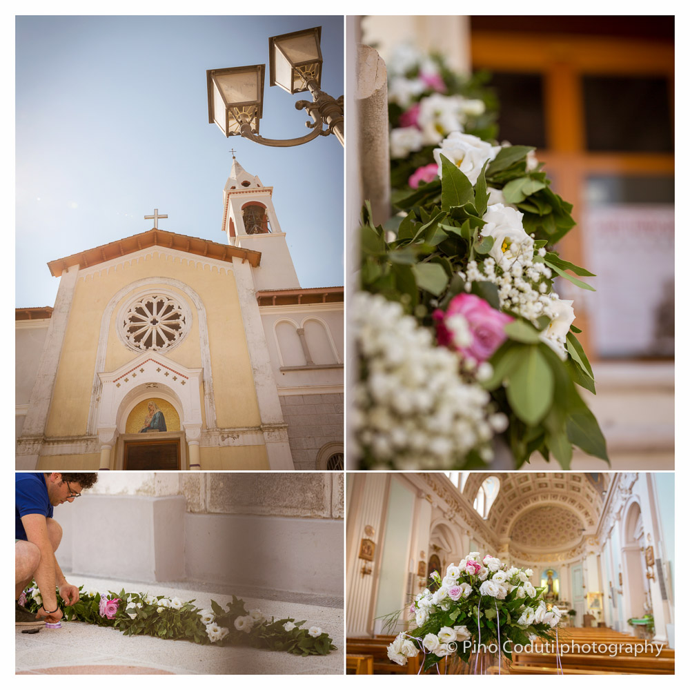 Mentre i fioristi erano all’opera per gli addobbi floreali in chiesa, la sposa terminava gli ultimi preparativi. Intanto a Manfredonia Ruggiero, lo sposo, sorridente ma anche decisamente emozionato, dopo una bella passeggiata lungo il porto nuovo si apprestava a partire. Alle undici in punto l’ingresso di Stefania dava il via alla funzione religiosa celebrata da carissimo don Costanzo, bravo come sempre a toccare le corde del cuore con le sue parole.