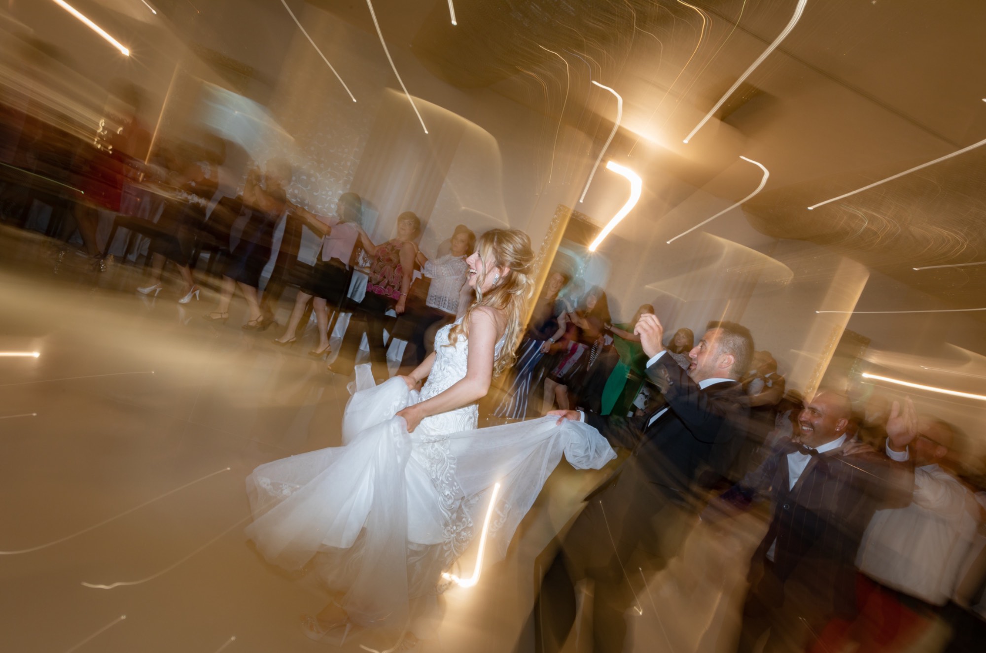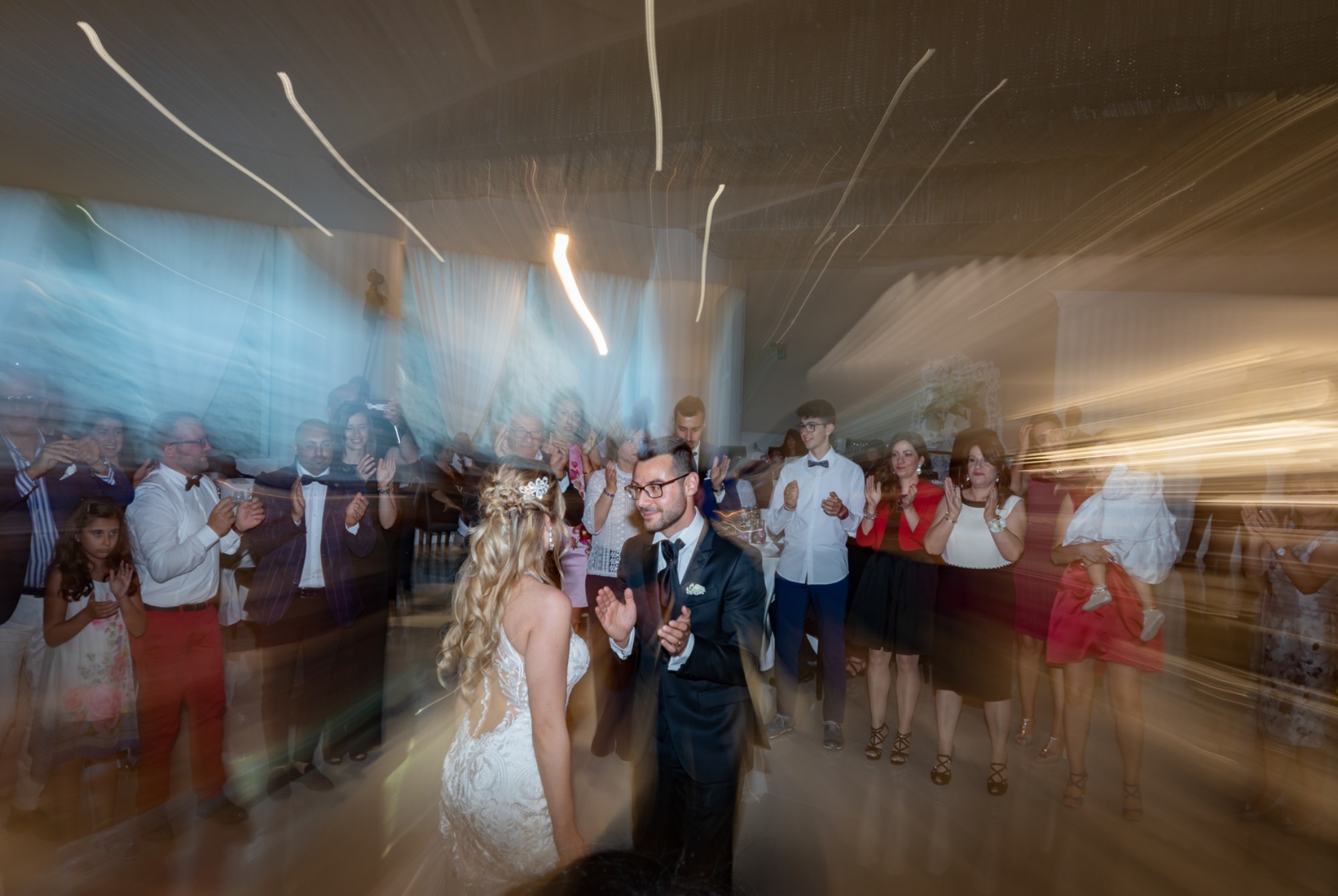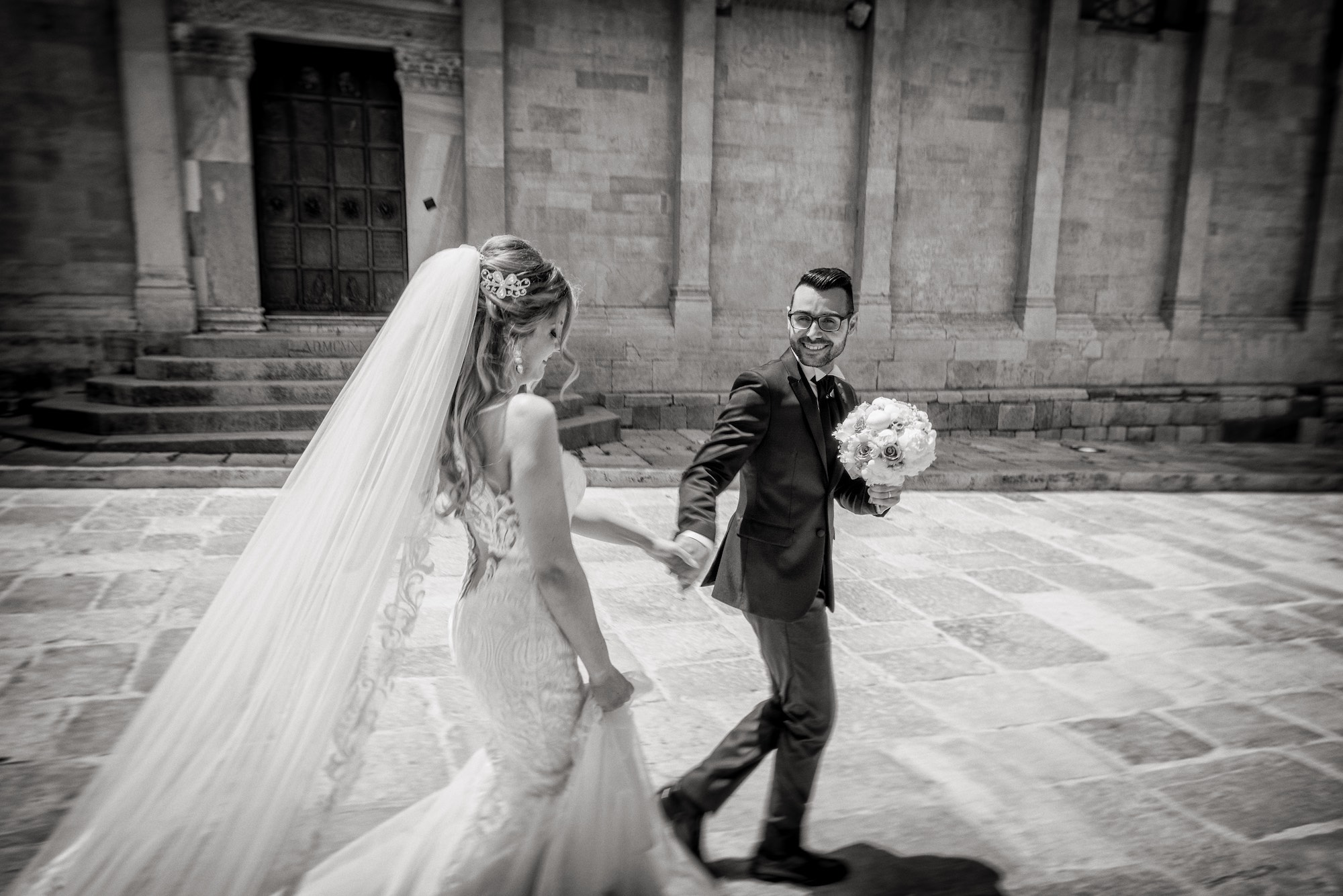 Il matrimonio si è svolto a Troia, un magnifico paese situato sulle pendici del Subappennino Dauno, a ridosso del Tavoliere delle Puglie. E la funzione religiosa, celebrata dal parroco Don Paolo, sì è tenuta in quello scrigno prezioso che è la Basilica di San Basilio Magno del XI secolo. Gli addobbi floreali sono stati curati da Di fiore in fiore di Foggia. All’uscita di chiesa gli sposi sono stati inondati da un tripudio di coriandoli che, con la complicità del vento, si sono trasformati in una fugace e roteante cornice astratta. Il tutto è durato solo pochi attimi ma è stato sufficiente affinché lo catturassimo in uno scatto incredibilmente bello.